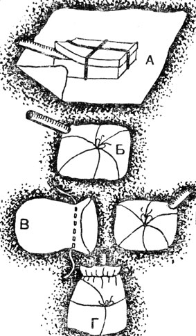 Перед демонстрацией фокуса производится "зарядка" посылки: исполнитель, приоткрыв крышку коробки, просовывает в один из ее углов на 1-1,5 см трубку, после чего перетягивает коробочку резиновым кольцом крест-накрест (рис. 14, А). Теперь можно начинать упаковывать "посылочку". Сначала коробочку помещают в кисет и затягивают его ленту на трубке (трубка в течение всего процесса упаковки должна оставаться снаружи). Затем коробочку в кисете завертывают в бумагу и перевязывают лентой, а потом "посылочку" завертывают в один из платков и снова в бумагу, которую также перевязывают лентой. Теперь "посылочку" помещают во второй кисет, затягивают его лентой, вновь тщательно заворачивают во все имеющиеся платки и в бумагу. Кисет следует каждый раз непременно перевязывать лентой.