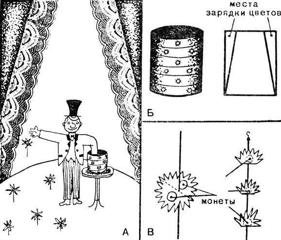 Ïîòîì èñïîëíèòåëü èçâëåêàåò èç öèëèíäðà öåëûå ãèðëÿíäû öâåòîâ è ïîäâåøèâàåò èõ íà íèòêå, ïðîòÿíóòîé ÷åðåç âñþ ñöåíó. Ñöåíà ïðåîáðàæàåòñÿ, óòîïàÿ â öâåòàõ (ðèñ. 22).  çàêëþ÷åíèå ôîêóñà èñïîëíèòåëü âíîâü ïîêàçûâàåò çðèòåëÿì ïóñòîé öèëèíäð.