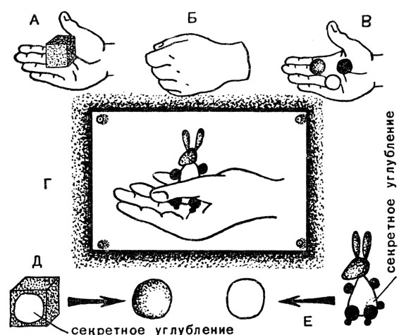 Из куска белой губки вырезается фигура зайчика. В нижней части его туловища делается отверстие и вырезается изнутри шаровидная полость, как и в кубике. Голова и уши зайчика окрашиваются в красный цвет, лапки и хвостик - в черный, туловище остается белым. Последняя деталь реквизита - шарик, вырезанный из губки и окрашенный в черный цвет. Этот шарик - без секрета.