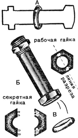 Äëÿ ôîêóñà ïîíàäîáèòñÿ ìåòàëëè÷åñêèé ñòåðæåíü äëèíîé 7-8 ñì è äèàìåòðîì 5 ìì - òàêîé, ÷òîáû íà íåãî ìîæíî áûëî íàäåòü îáðó÷àëüíîå êîëüöî ëþáîãî ðàçìåðà. Îäèí êîíåö ñòåðæíÿ - ñ ðåçüáîé, íà íåãî íàâèí÷èâàåòñÿ ãàéêà. Äðóãîé êîíåö - áåç ðåçüáû. Íà íåãî ïëîòíî íàäåòà ñåêðåòíàÿ ãàéêà â ôîðìå ãîëîâêè áîëòà (ðèñ. 48, Â). Îíà ðàçðåçàíà ïîïåðåê íà äâå ïîëîâèíû. Íà îáîèõ òîðöàõ îäíîé ïîëîâèíû èìåþòñÿ ïî äâà øèïà, à íà îáîèõ òîðöàõ âòîðîé - ïî äâà ñîîòâåòñòâóþùèõ èì îòâåðñòèÿ. Øèïû ïëîòíî âõîäÿò â îòâåðñòèÿ, è ëèíèÿ ðàçðåçà ãàéêè ñòàíîâèòñÿ íåçàìåòíîé. Òîëùèíà êàæäîé ãàéêè ïðèìåðíî 1-1,5 ñì; íàðóæíûé ðàçìåð áåðåòñÿ ñ òàêèì ðàñ÷åòîì, ÷òîáû ëþáîå êîëüöî íå ìîãëî ñîñêî÷èòü ñî ñòåðæíÿ.