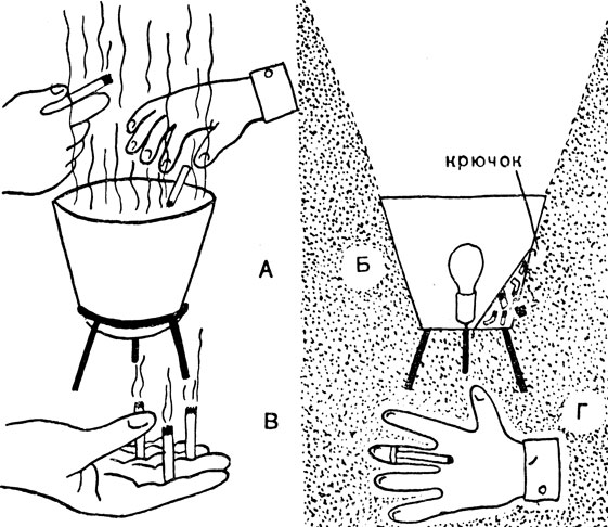 На средний палец правой руки с тыльной стороны надевают скобку-держатель с насаженной на ней негорящей папиросой. Между пальцами левой руки со стороны ладони втыкают три горящих сигареты (рис. 46, В и Г). Затем начинают демонстрацию фокуса.