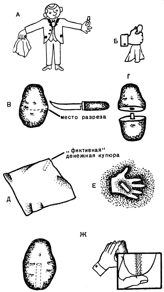 Взяв деньги у одного из зрителей, исполнитель свертывает их в плоскую трубочку и надевает на нее резинку, чтобы трубочка не развернулась. Затем, достав платочек, вместо настоящей денежной купюры закручивает в нем бумажную трубочку, вшитую в угол платочка, и дает подержать ее приглашенному зрителю. Настоящая денежная купюра остается в руке фокусника (рис. 40, Е). Держа ее, он подходит к своему столу, где лежит заранее приготовленная картофелина с секретом.