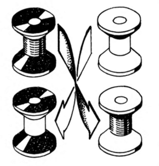 Åñëè íàêðûòü èõ è íåçàìåòíî ïåðåâåðíóòü, ïîêàæåòñÿ, ÷òî íèòêè "ïåðåõîäÿò" ñ îäíîé êàòóøêè íà äðóãóþ. Íà ñàìîì æå äåëå ïðîñòî ìåíÿåòñÿ ðàñïîëîæåíèå êàòóøåê.