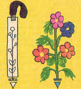Êîãäà ñèëüíî íàäàâëèâàåòå ðó÷êîé òðîñòè íà ñòåðæåíü, åãî îñòðèå ãëóáîêî âîíçàåòñÿ â äîùàòûé íàñòèë ñöåíû. Êîãäà âû áûñòðî ïîäíèìàåòå òðîñòü ââåðõ, öâåòû ðàñêðûâàþòñÿ, îñâîáîæäàÿñü îò òðóáêè. À ñàìè öâåòû ìîæíî ñäåëàòü èç êóñî÷êîâ ïëàñòèêà èëè áóìàãè.