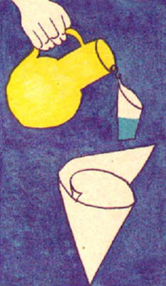 Èç ëèñòà ïëîòíîé áóìàãè ñâåðòûâàåòå êóëåê. Çàòåì áåðåòå ñî ñòîëèêà ïðîçðà÷íûé ñòåêëÿííûé êóâøèí ñ âîäîé è íàëèâàåòå â êóëåê âîäó. Êóâøèí ñòàâèòå íà ñòîëèê, à êóëåê ðàçâîðà÷èâàåòå è äàåòå çðèòåëÿì äëÿ îñìîòðà. Îí ñóõîé.
