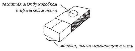 Âû ñðàçó æå çàêðûâàåòå êîðîáîê è âñòðÿõèâàåòå åãî, ÷òîáû çðèòåëü óñëûøàë, êàê ìîíåòêà ãðåìèò âíóòðè. Íà ñàìîì äåëå ýòî ãðåìèò âòîðàÿ ìîíåòà, êîòîðàÿ, êàê âû âèäèòå íà ðèñóíêå, áûëà ðàíåå çàæàòà ìåæäó êðàåì ÿùè÷êà êîðîáêà è åãî êðûøêîé. Êîãäà êîðîáîê çàêðûâàåòñÿ, ìîíåòêà ïîïàäàåò âíóòðü.