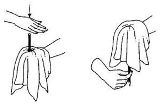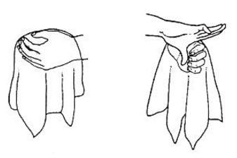 ×òîáû ïðîäåìîíñòðèðîâàòü çðèòåëÿì ïëàòîê àáñîëþòíî öåëûì, ðàçîæìèòå ïîä íèì ëåâûé êóëàê è áûñòðî ïåðåâåðíèòå ðóêó îòêðûòîé ëàäîíüþ êâåðõó. Â ðåçóëüòàòå ýòîãî äâèæåíèÿ âàøà íåâèäèìàÿ ñêëàäêà ðàçãëàäèòñÿ ñàìà ñîáîé.