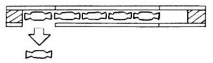 Ïàëî÷êà äåëàåòñÿ èç ïëîòíîé áóìàãè.  áóìàæíóþ òðóáêó äèàìåòðîì 2 ñì âêëåèâàåòñÿ ñ îáåèõ ñòîðîí ïî äåðåâÿííîìó öèëèíäðèêó, êàæäûé äëèíîé 5 ñì. Ñî ñòîðîíû îäíîãî èç íèõ - â ìåñòå, ãäå çàêàí÷èâàåòñÿ öèëèíäðèê, â òðóáêå äåëàåòñÿ ïðÿìîóãîëüíîå îêîøêî äëèíîé 6 ñì, ÷òîáû îòòóäà ñâîáîäíî ìîãëà âûïàñòü îäíà êîíôåòà.