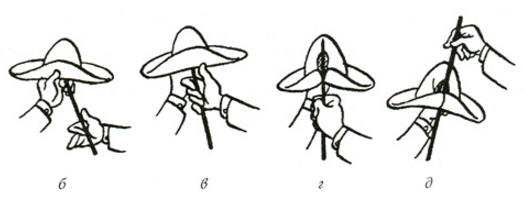 Íå âûïóñêàÿ "âîëøåáíîé ïàëî÷êè", âû ïåðåõâàòûâàåòå øëÿïó ïðàâîé ðóêîé èç ëåâîé (ðèñ. â) òàê, ÷òîáû áîëüøîé ïàëåö ïðàâîé ðóêè, îäíîâðåìåííî óäåðæèâàÿ ïàëî÷êó, ïðèæàë ïîëÿ øëÿïû ê òóëüå.  òîò æå ìîìåíò ëåâàÿ ðóêà, ââåäåííàÿ âíóòðü øëÿïû, çàõâàòûâàåò åå èçíóòðè òàê, ÷òîáû ïîëÿ øëÿïû, îõâàòûâàþùèå áîëüøîé ïàëåö ïðàâîé ðóêè, ñîìêíóëèñü äðóã ñ äðóãîì âîêðóã ýòîãî áîëüøîãî ïàëüöà.